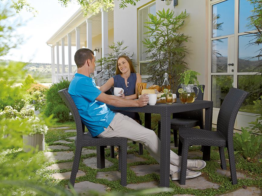 Čtvercový plastový stůl od firmy KETER. Moderní vzhled - imitace ratanové struktury. Stůl je vhodný k usazení až 4 osob. Stůl je odolný v nepřízni počasí i UV záření. Snadná údržba.