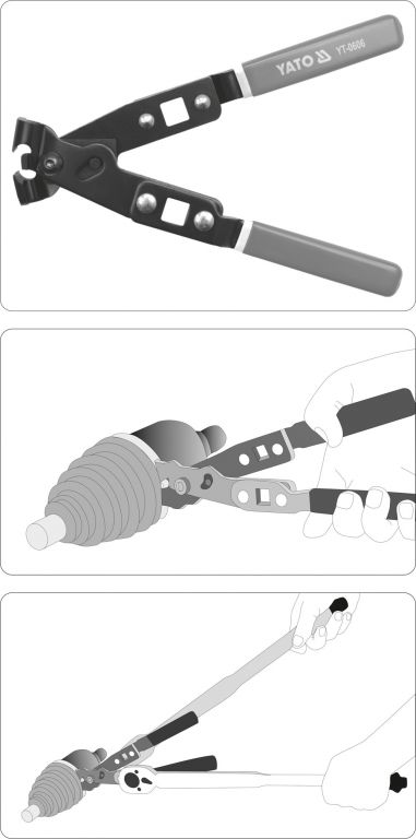 Kleště pro de/montáž manžet kloubů. Pro zjednodušení práce je možné nasazení ráčen 1/2", díky otvorům z bočních stran kleští.