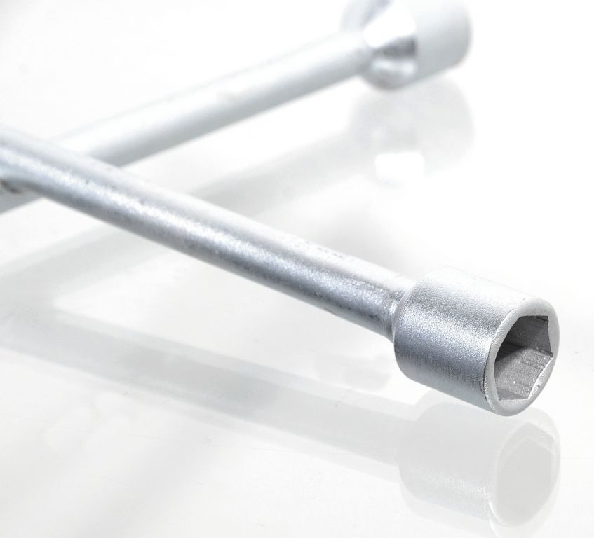 Celokovový klíč ve tvaru kříže, který je určen pro povolování či utahování matic kol automobilů. Vhodné do každé garáže.