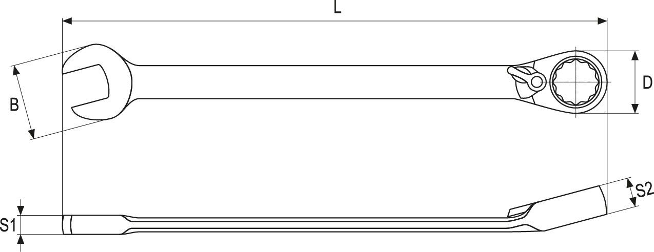 Očkoplochý klíč s dvanáctihranným profilem opatřeným ráčnou s jemným 72 zubým chodem a přepínačem levého/pravého chodu.