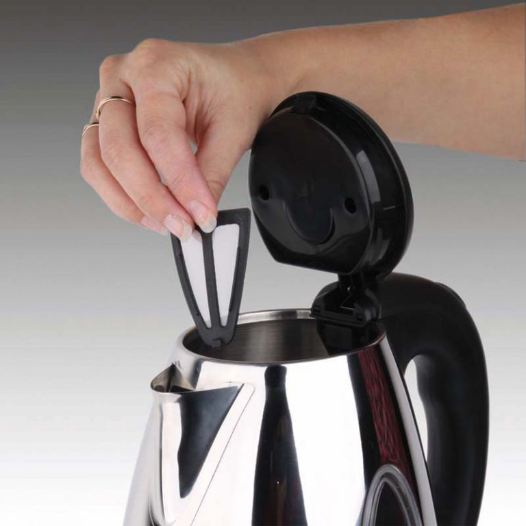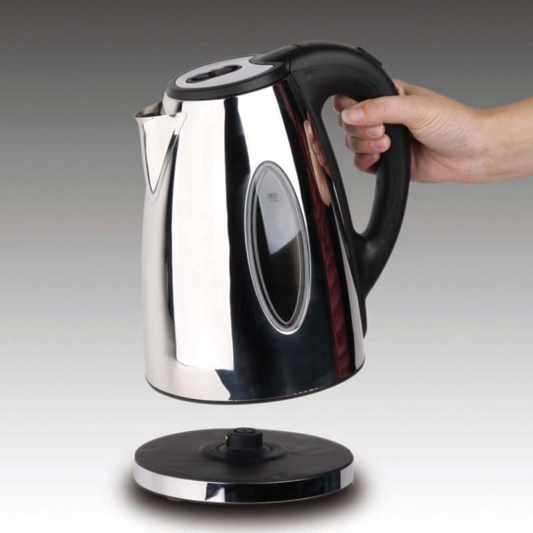 Moderní rychlovarná konvice v kombinaci nerez oceli a černého plastu, s ochranou při zapnutí bez vody. Objem: 1,7 l.