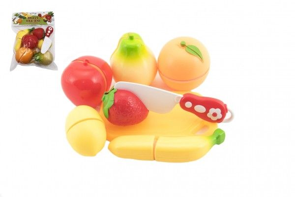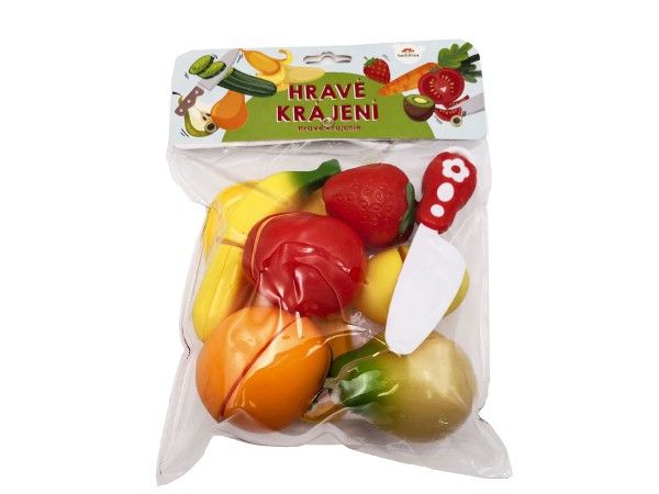Jednotlivé dílky ovoce jsou spojeny suchým zipem a je možné je jednoduše "krájet" přiloženým nožíkem. Sada obsahuje různé druhy ovoce, prkénko a nožík.