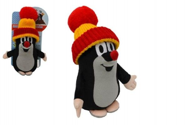 Mikro-plyšový Krteček se sundavací čepicí v barvě červeno-žluté.