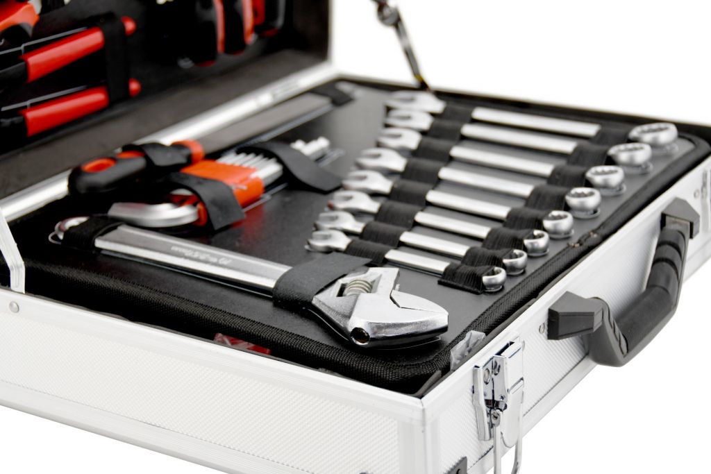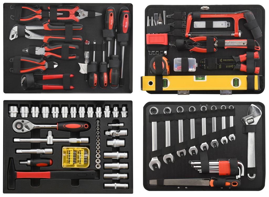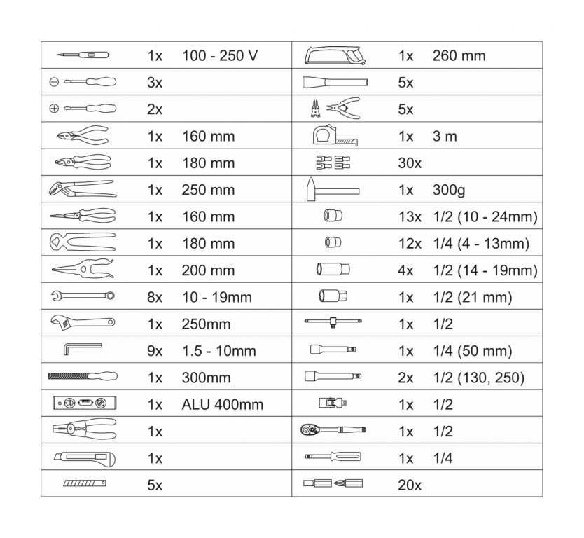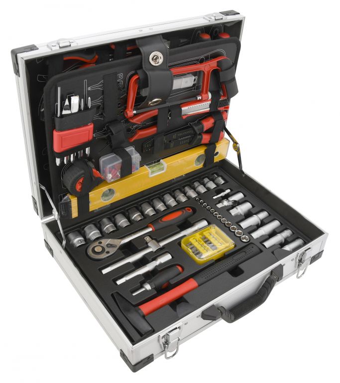 Přenosný kufr vybavený exkluzivním CR-V nářadím, včetně očkoplochých klíčů, vodováhy a dalšího nářadí uspořádaného do předem určených pozic v celkem 4 platech. Dno kufru je opatřeno vložkou pro ráčnu s 45 zubým mechanismem a jejími nástavci a příslušenstvím, dále kladivem a ráčnovým šroubovákem včetně bitů. Vrchní část kufru je osazena šroubováky různých rozměrů, včetně elektrikářské zkoušečky. Dále nejběžněji používanými kleštěmi, včetně kombinovaných, štípacích a střihacích. Mezi dnem a vrchní částí je pevně vložené oboustranné plato s očkoplochými klíči, nastavitelným klíčem, pilníkem a imbusovými klíči z jedné strany. Z druhé strany jsou umístěny vodováha, metr, nůž s náhradními čepelemi, pilka, důlčíky, kleště na segerovky a elektrikářské kleště včetně konektorů.