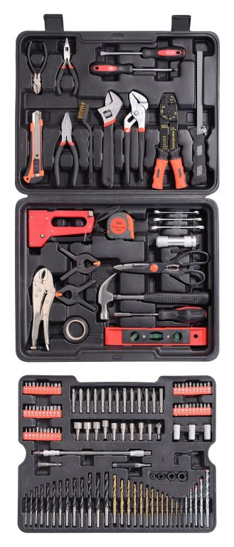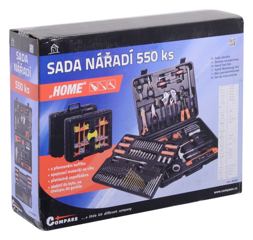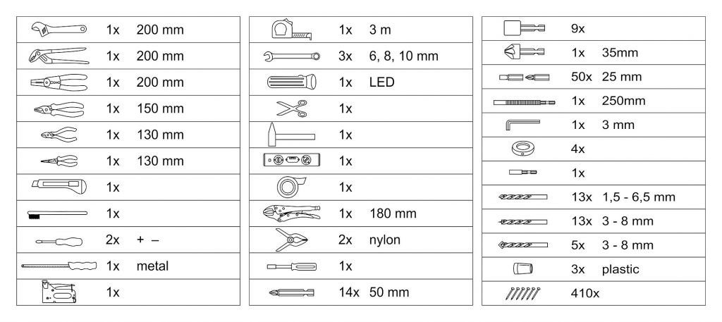 Vše uspořádáno v přehledných pozicích, uvnitř navíc jedno plato s nástroji. Sada obsahuje celou řadu vrtáků, bitů, nástrčných klíčů, šroubováky, kleště, kladivo, vodováhu, stranové klíče, základní spojovací materiál a celou řadu dalšího nářadí, které je vhodné pro použití jak doma, v garáži, tak i na cestách.
