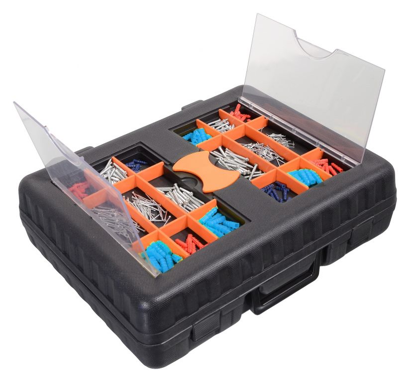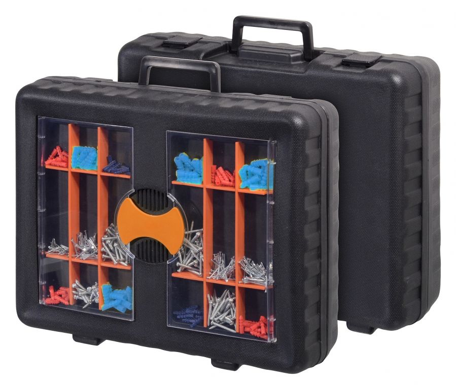 Praktický přenosný kufřík s kvalitním nářadím a se spojovacím materiálem. Spojovací materiál je umístěn ve víku kufru.