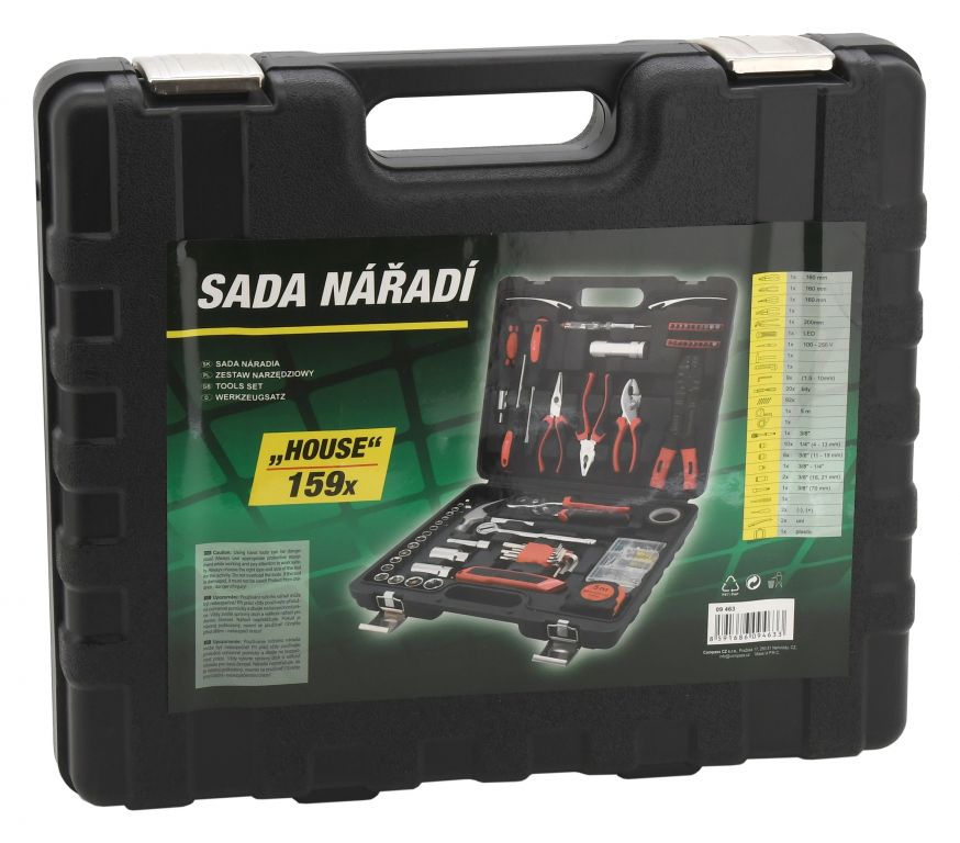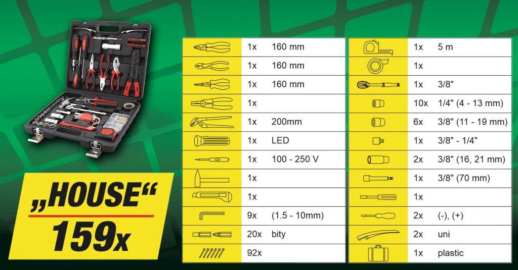Praktický přenosný kufřík s kvalitním nářadím a základním spojovacím materiálem. Sada obsahuje ergonomické šroubováky, imbusové klíče, žiletkový nůž, nejběžnější typy kleští včetně elektrikářských, kladivo, 3/8" ráčnu s nástavci, LED svítilnu, šroubovák na bity včetně 20ks bitů, svinovací metr (5 m), izolační pásku a další. Mimojiné je sada opatřena pouzdrem s 92 ks spojovacího materiálu. Je obzvláště vhodný pro domácí použití, ale uplatnění najde i v garážích a na cestách.