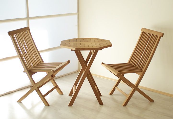 Exkluzivní zahradní set vhodný na malé balkóny, terasy i jen tak na zahradu. Skládá se ze 2 skládacích dřevěných zahradních židlí z teaku (extrémně odolné tvrdé dřevo) a kulatého (osmihranného) balkonového stolu o průměru 60 cm. Masivní zahradní nábytek je vyroben z prvotřídního, ošetřeného teaku. Ošetřovaný teak je odolný a dřevo je tak chráněno proti povětrnostním vlivům. Sedací sestava se skládá ze 3 částí. 2 skládací židle 1 kulatý balkonový stůl. Masivní dřevo je ošetřeno a certifikováno SVLK, tedy pochází z kontrolovaného, udržitelného pěstování. Teak je robustní a odolný vůči povětrnostním vlivům. Trvanlivost lze navíc prodloužit pravidelnou péčí teakovým olejem.
