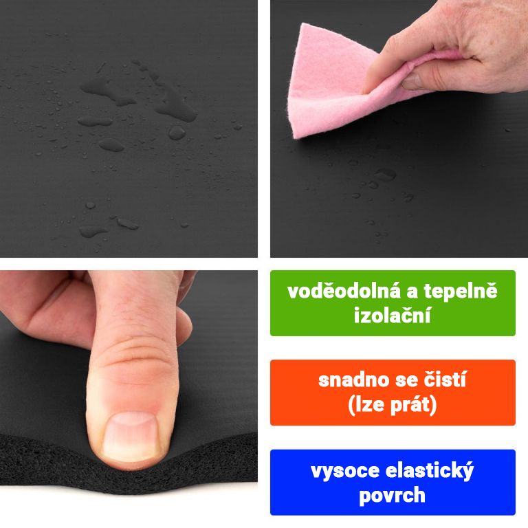 Fitness podložka je odolná proti roztržení a uklouznutí je také voděodolná (omyvatelná) a tepelně izolační, proto je vhodná i na kempování. Kromě toho tlumí nárazy, takže je šetrná ke kloubům. Bez změkčovadel (bez ftalátů). Tato vysoce kvalitní gymnastická podložka z pěny šetrné k pokožce přesvědčí výškou (tloušťkou) 15 mm. Po použití ji lze snadno znovu srolovat.