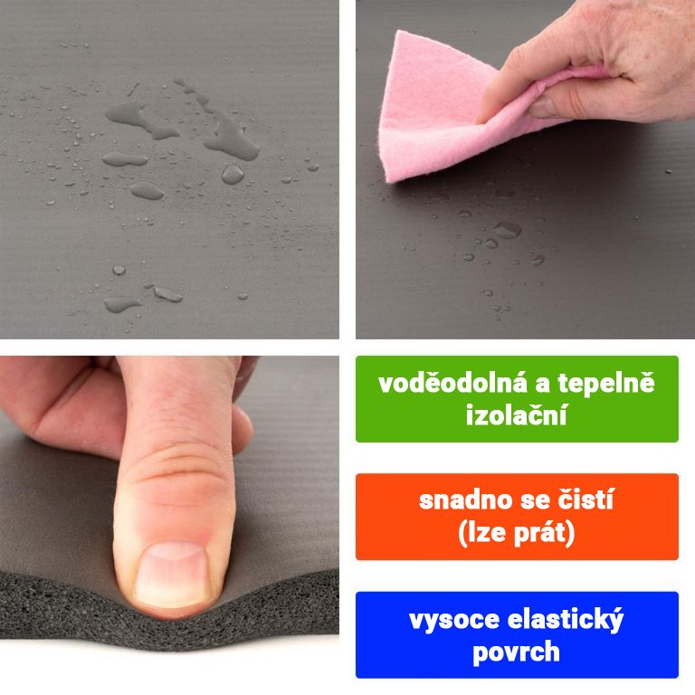 Fitness podložka je odolná proti roztržení a uklouznutí je také voděodolná (omyvatelná) a tepelně izolační, proto je vhodná i na kempování. Kromě toho tlumí nárazy, takže je šetrná ke kloubům. Bez změkčovadel (bez ftalátů). Tato vysoce kvalitní gymnastická podložka z pěny šetrné k pokožce přesvědčí výškou (tloušťkou) 15 mm. Po použití ji lze snadno znovu srolovat.