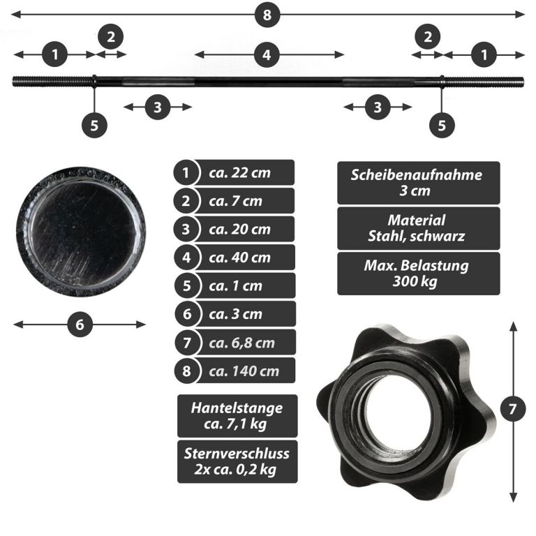 Optimální činka pro použití v posilovně i doma, vhodná pro trénink hrudníku, paží, ramen, krku, posilování, rehabilitační sporty, kulturistiku, bench press, mrtvé tahy, dřepy, výpady, kliky a další. Je vhodná pro dostupné zátěžové desky s 3 cm držákem kotouče a průměrem otvoru 30/31 mm. Protiskluzová deska je upevněna pojistným kroužkem, aby se zabránilo sklouznutí závaží při pohybu. Hvězdicové zámky, které lze rychle vyměnit, bezpečně fixují závaží na tyči činky a zaručují snadnou výměnu závaží. Rukojeti jsou křížově vroubkované pro bezpečné uchopení.