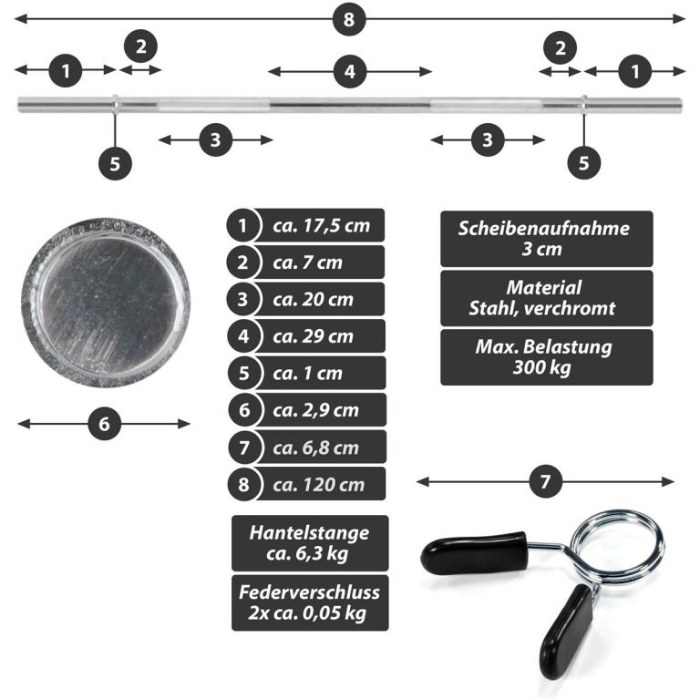 Optimální činka pro použití v posilovně i doma, vhodná pro trénink hrudníku, paží, ramen, krku, posilování, rehabilitační sporty, kulturistiku, bench press, mrtvé tahy, dřepy, výpady, kliky a další. Je vhodná pro dostupné zátěžové desky s 3 cm držákem kotouče a průměrem otvoru 30/31 mm. Protiskluzová deska je upevněna pojistným kroužkem, aby se zabránilo sklouznutí závaží při pohybu. Pružiny, které lze rychle vyměnit, upevňují závaží bezpečně na tyč činky a zaručují snadnou výměnu závaží. Rukojeti jsou křížově vroubkované pro bezpečné uchopení.