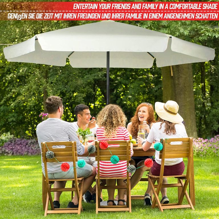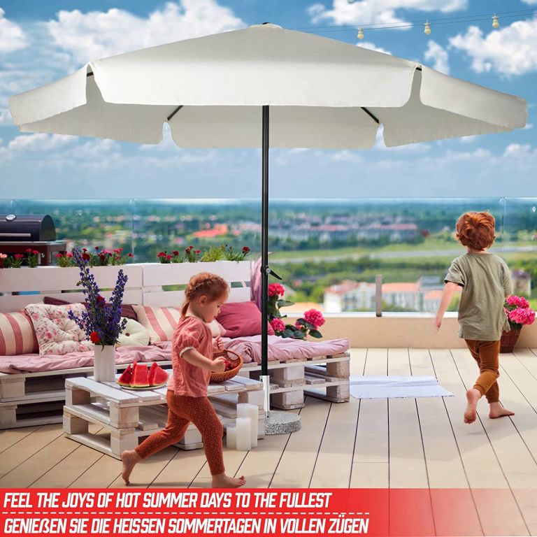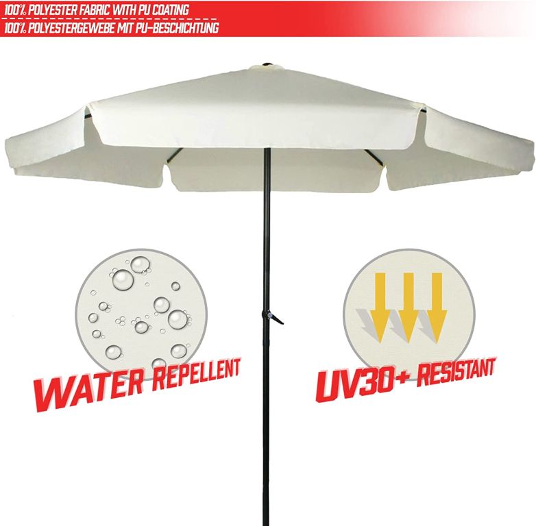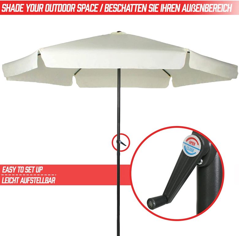 Tento elegantní slunečník s klikou v krémové barvě dodá vaší zahradní dekoraci zvláštní šarm. Díky navíjecímu mechanismu lze slunečník venku snadno otevřít a zavřít. Přístřešek slunečníku se snadno čistí. Zahradní slunečník je vyroben z vodoodpudivé polyesterové tkaniny.