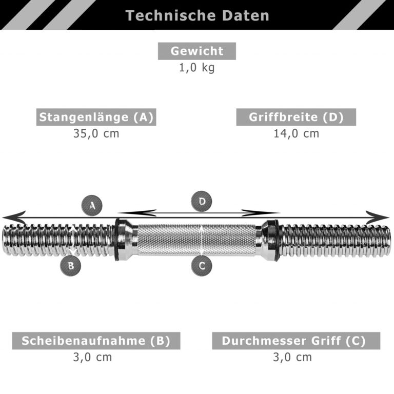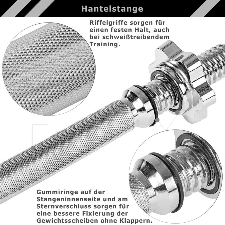 S touto sadou je možné snadno sestavit tréninkový plán pro efektivní trénink celého těla. Je také prostorově nenáročný a snadno se přenáší, takže je ideální na cesty nebo domů. Ergonomický tvar pro trénink šetrný k loktům a zápěstí, protiskluzové rukojeti s křížovým vroubkováním zajišťují bezpečný úchop i při pocení, hvězdicové zámky a tyč na činku z chromované oceli, 30 mm kotoučové uchycení. Hvězdicové zámky zajišťují, že zátěžové kotouče vždy pevně a bezpečně spočívají na tyčích činky.