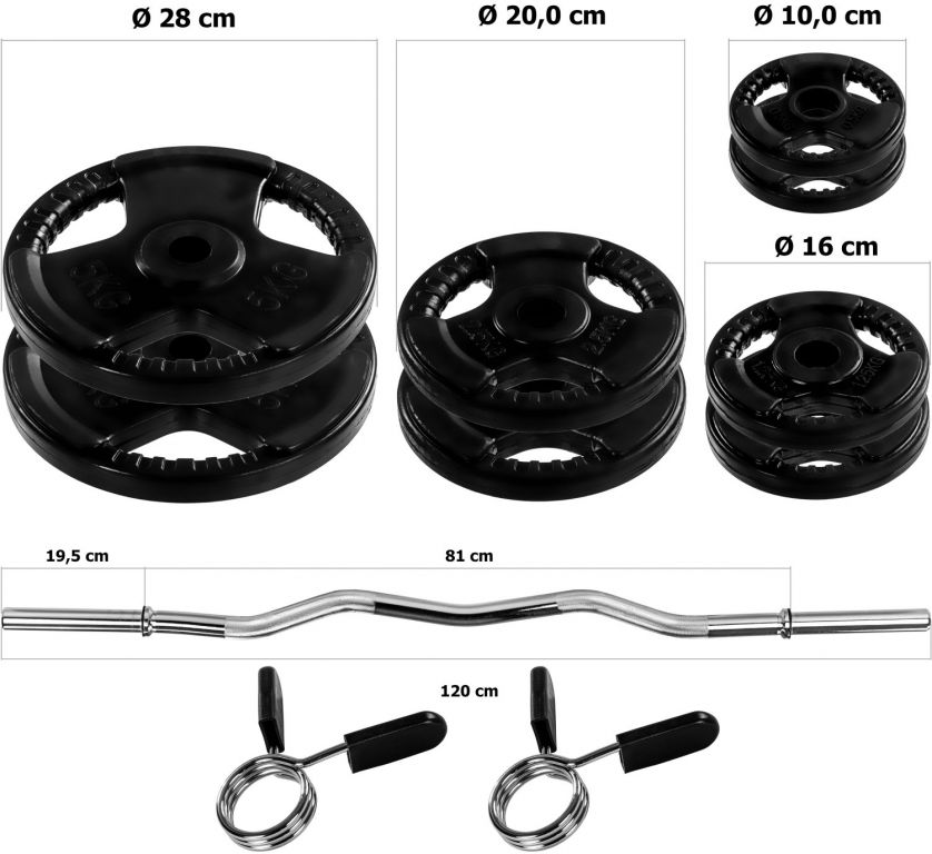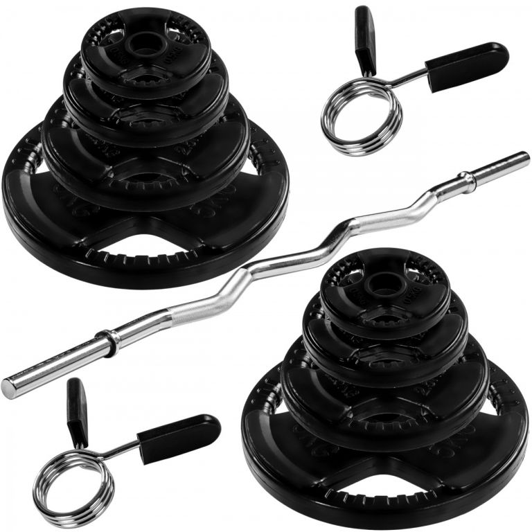 Tato posilovací sada šetří místo a snadno se přepravuje, díky čemuž je ideální pro cesty i doma. Zvlněná posilovací tyč má ergonomický tvar pro trénink šetrný k loktům a zápěstí. Protiskluzové rukojeti s křížovým rýhováním zajišťují bezpečné uchopení i při potu. Pružinové uzávěry a činka z chromované oceli, upevnění disku 30 mm (standardní). Maximální zatížení je 120 kg. Díky speciálnímu tvaru závaží je možné se závažím cvičit i bez tyče. Pogumování závaží chrání podlahu při odkládání.