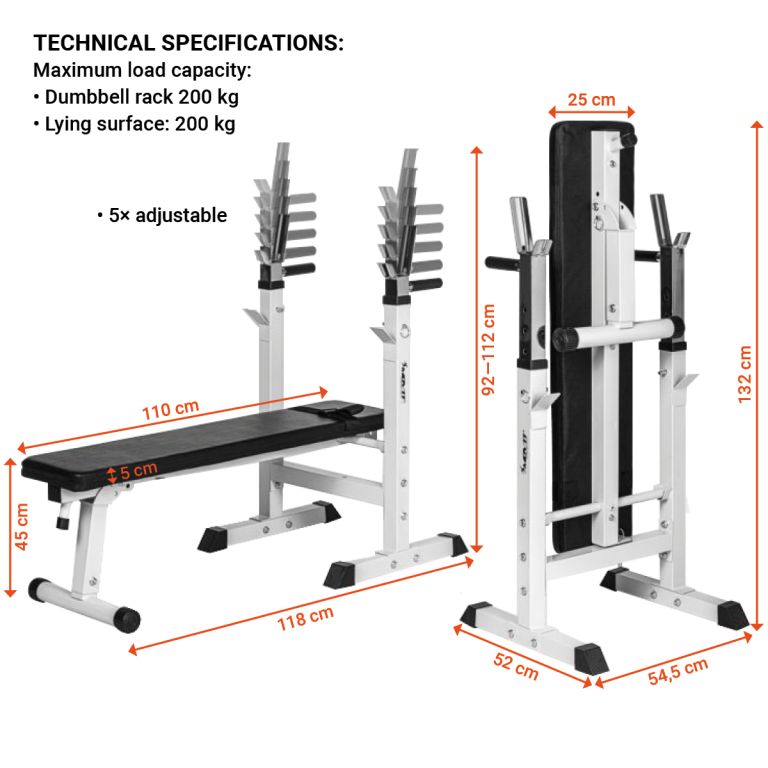 Pětipolohová nastavitelná lavice na posilování s integrovanými držáky. Díky sklopným nohám lze posilovací lavici použít také jako šikmou lavici, včetně popruhu na nohy. Lavici můžete v případě potřeby složit a uložit, díky svým rozměrům nezabere příliš místa.