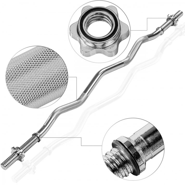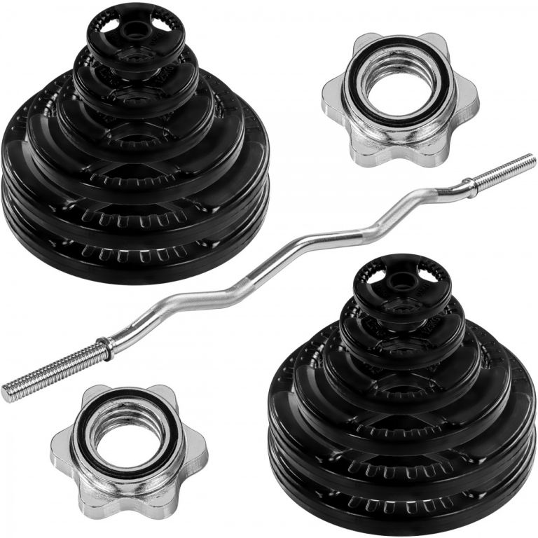 Posilovací sada s hrazdou a vybavením šetří místo a snadno se přepravuje, díky čemuž je ideální pro cesty i doma. Zvlněná posilovací tyč má ergonomický tvar pro trénink šetrný k loktům a zápěstí. Protiskluzové rukojeti s křížovým rýhováním zajišťují bezpečné uchopení i při potu, pružinové uzávěry a činka z chromované oceli, upevnění disku 30 mm (standardní). Maximální zatížení je 120 kg.