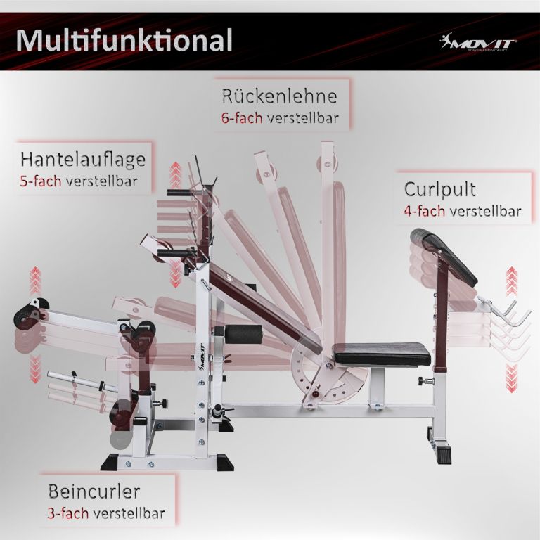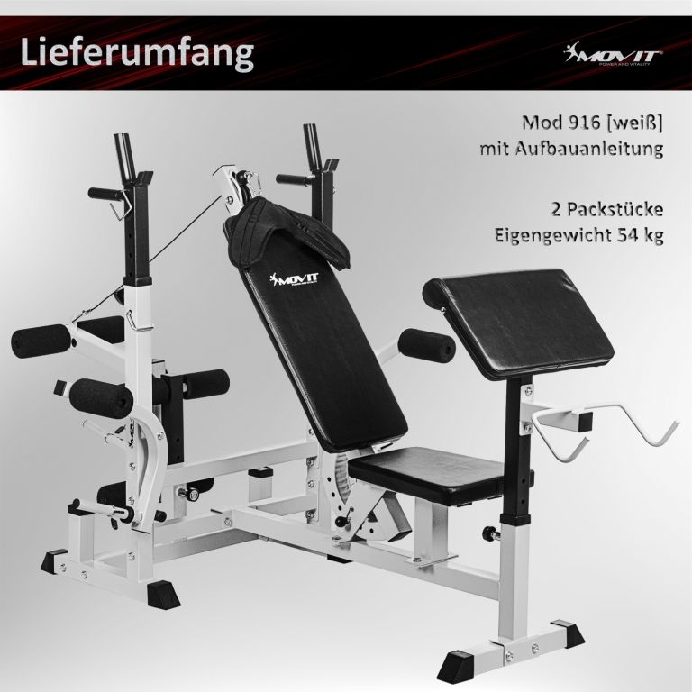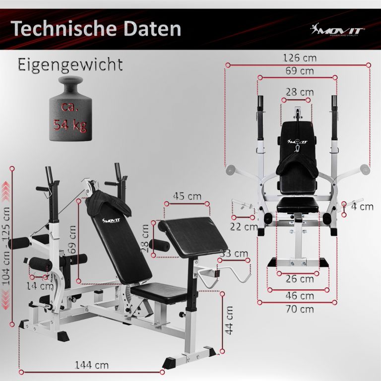 Kombinovaná dlouhá a šikmá lavice, vícenásobně nastavitelné opěradlo a stojan na činky, integrovaný modul kabelové kladky, dvě rukojeti pro ponoření, dva stojany na zadní straně pro vybavení, pogumované stabilní nožičky. Dlouhý stojan na činky (až 180 kg), motýlí ramena (každé až 40 kg), snadno vyměnitelný stojan na kotouly a kleště na nohy (až 60 kg)