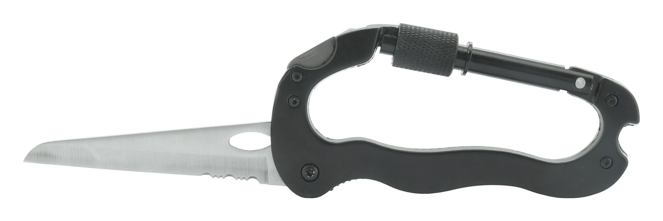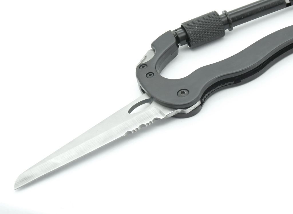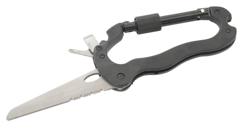 Rozměry karabiny 116 x 66 mm zajistí bezpečné uchycení veškeré kempingové výbavy. Karabina je opatřena nožem délky 7,5 cm s pilkovou částí, nůž je opatřen pojistkou, takže nehrozí jeho nechtěnné složení. V horní části jsou potom k dispozici šroubovací nástavce křížový a plochý. Karabina je prakticky tvarována, zejména pro pohodlné použití nože.