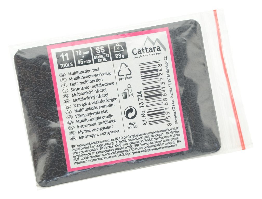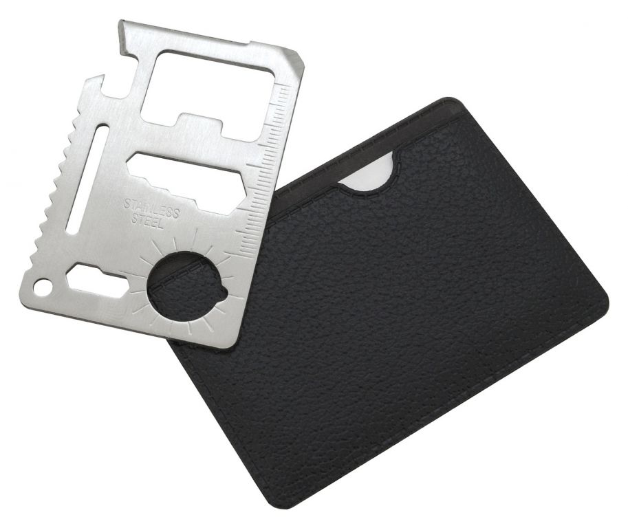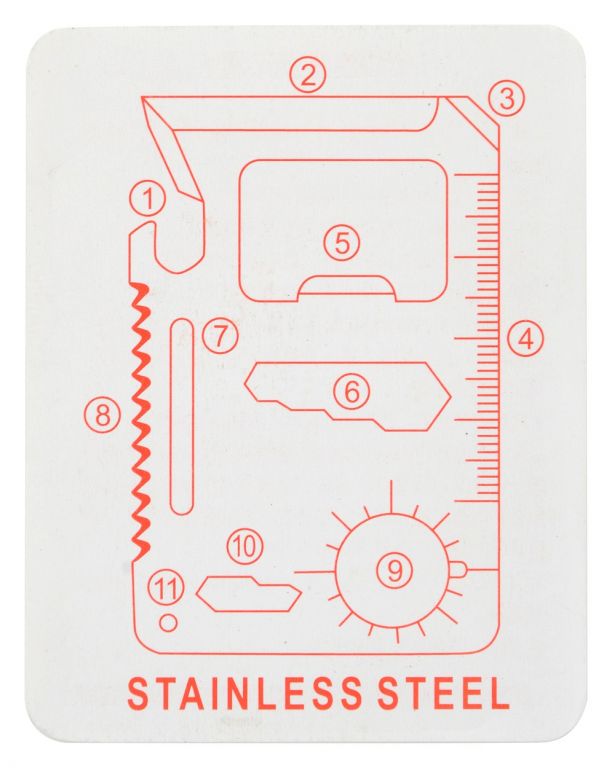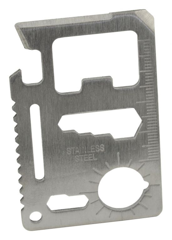 Multifunkční outdoor nástroj k přežití, poskytující 11 funkcí užitečných v různých situacích. Jedná se o drobný nástroj rozměrů 70 x 45 mm z kvalitní nerezové oceli o síle 1,7 mm. Nástroj je vybaven otvírákem na plechovky a lahve se zátkami, nožíkem, šroubovákem, měřítkem s milimetrovou stupnicí, pomocným směrovým ukazatelem na mapu, klíčem na matice a šrouby 4 nejběžnějších rozměrů, klíčem na křídlaté matice, 2 polohovým klíčem a v neposlední řadě pilkou.
