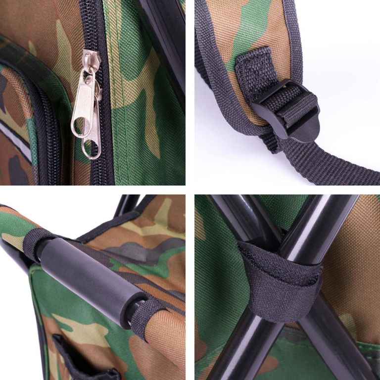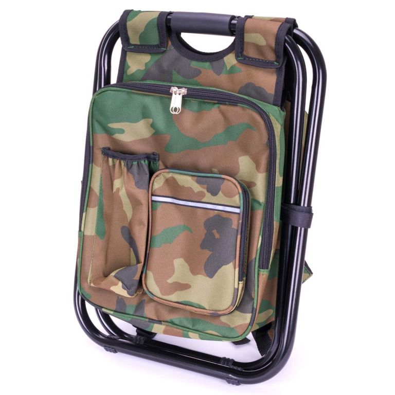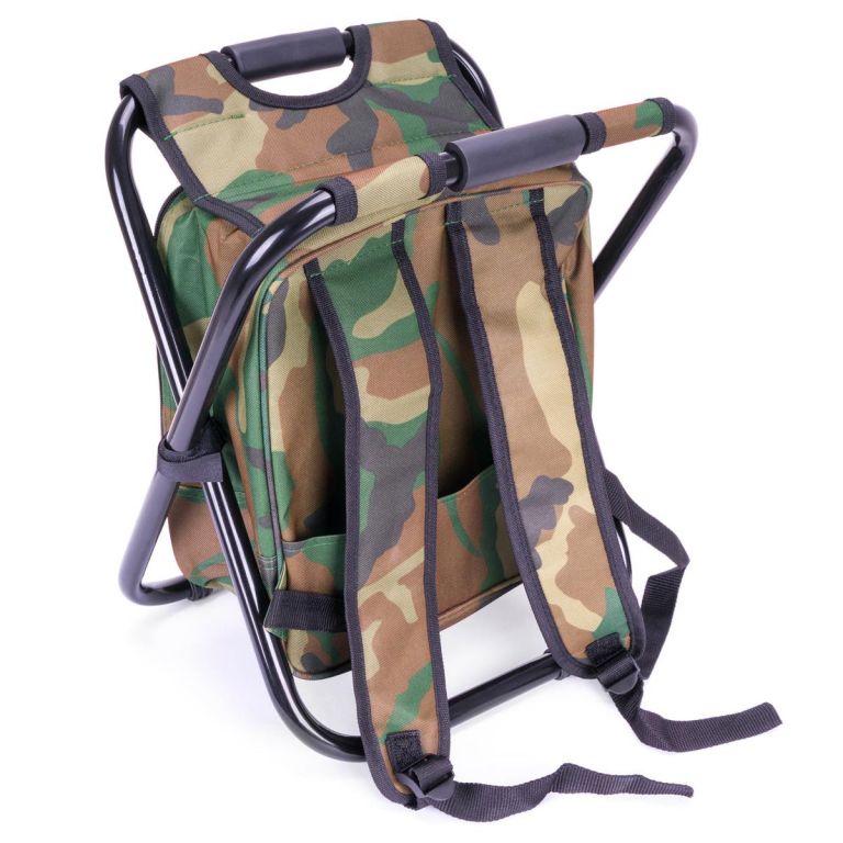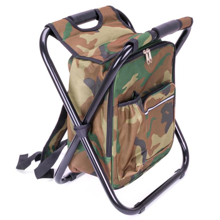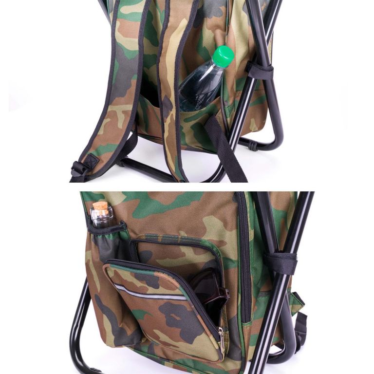 Turistický batoh v maskovací barvě se skládací stoličkou, chladicí taškou, držákem na nápoje, vnějšími kapsami.