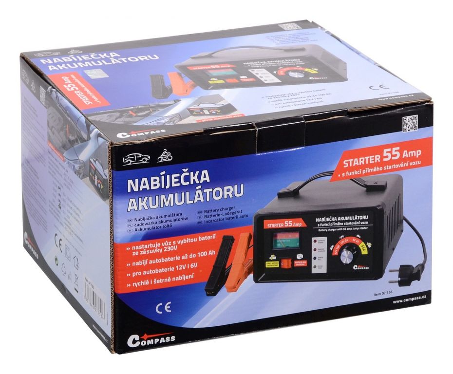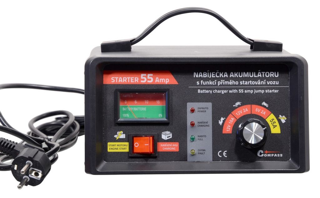 Nabíječka akumulátorů 6/12V 10A s napájením 230V a s funkcí přímého startování vozu. Funkce STARTER 55 Amp umožňuje nastartovat vozidlo s vybitou baterií tak, jako kdy bylo startováno pomocí startovacích kabelů z jiného vozidla. Nabíječka akumulátoru umožňuje nabíjet rychle nebo pomalu (velmi šetrně) autobaterie 12V i 6V a je vhodná pro kapacitu baterie až 100 Ah. Je určena k nabíjení olověných akumulátorů.