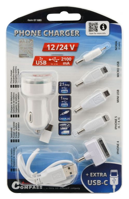 Nabíječka umožňující nabíjení z klasické 12V či 24V zásuvky autozapalovače. Zařízení je schopné napájet či nabíjet mobilní telefony, MP3 přehrávače a další zařízení schopné dobíjení či napájení pomocí některého z přiložených adaptérů či pomocí klasického USB kabelu. Balení obsahuje nabíječku USB, propojovací kabel a sadu adaptérů vhodných pro telefony iPhone 4, iPhone 5, Samsung, HTC, Nokia a další.
