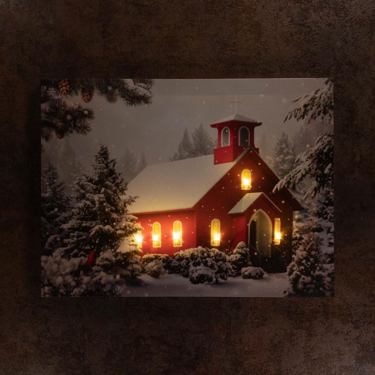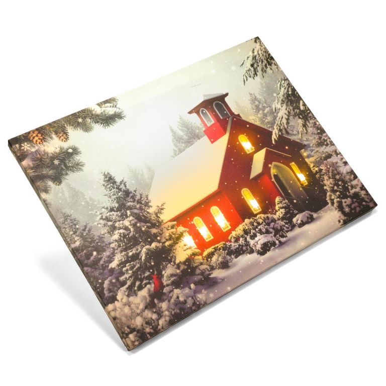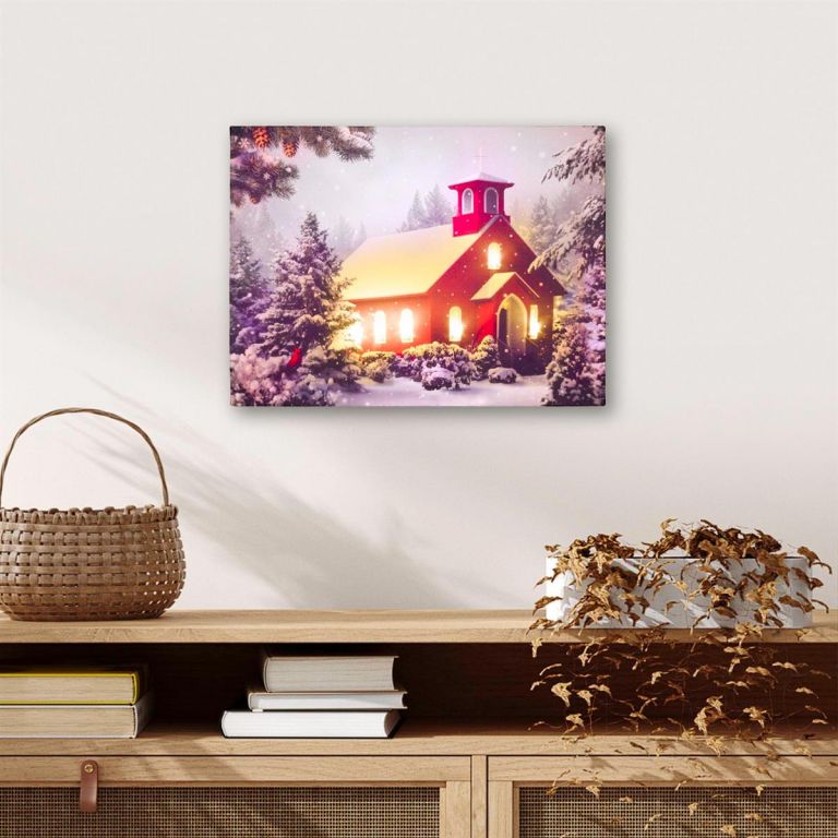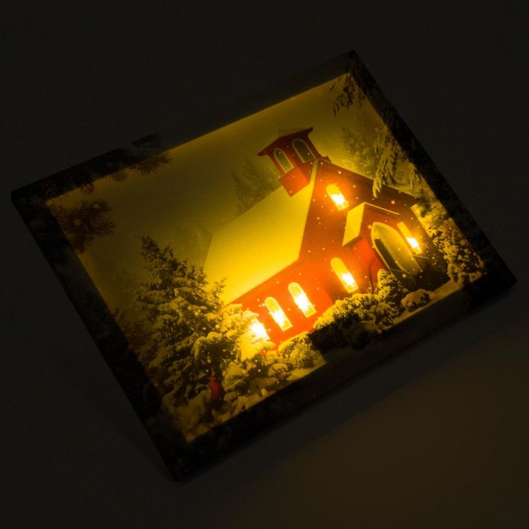 Nástěnná malba zasněžená kaple, 6 LED, 30 x 40 cm