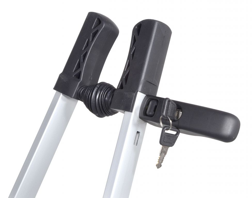 Univerzální střešní nosič pro jízdní kolo s jednoduchým systémem upevnění. Upevnění kola do nosiče se provádí pomocí držáku na rám a jednoduchých objímek s fixační sponou, kterou lze upevnit i jednou rukou. Mechanismus je uzamykací a nehrozí tak odcizení kola. Nosič je vhodný pro všechny jízdní kola, nepřesahující hmotnost 15 kg. Nosič je precizně zhotoven z hliníku stříbrné barvy, umožňuje uchycení jak na klasický střešní nosič pomocí U třmenů, tak i na nosiče s T drážkou 20 mm.