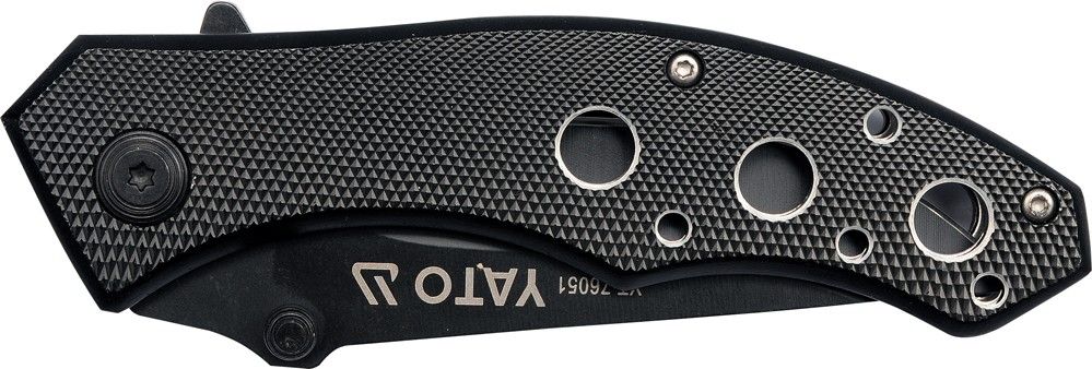 Nůž je určen především pro milovníky nožů a fandy značky Yato. Čepel je zhotovena z kvalitní nerezové oceli, lakované do matné, černé barvy a je vybavena výstupky z vrchní i spodní strany, zamezující sklouznutí ruky a možného poranění při používaní. Samozřejmostí je pak jednoduchá pojistka, která se používá posunem do strany, čímž se uvolní čepel a je tak možné nůž rychle a pohotově složit. Rukojeť nože je profilovaná pro příjemný, pohledný a v neposlední řadě bezpečný úchop. Navíc je z jedné strany vybavena klipem pro uchycení např. na oděv.
