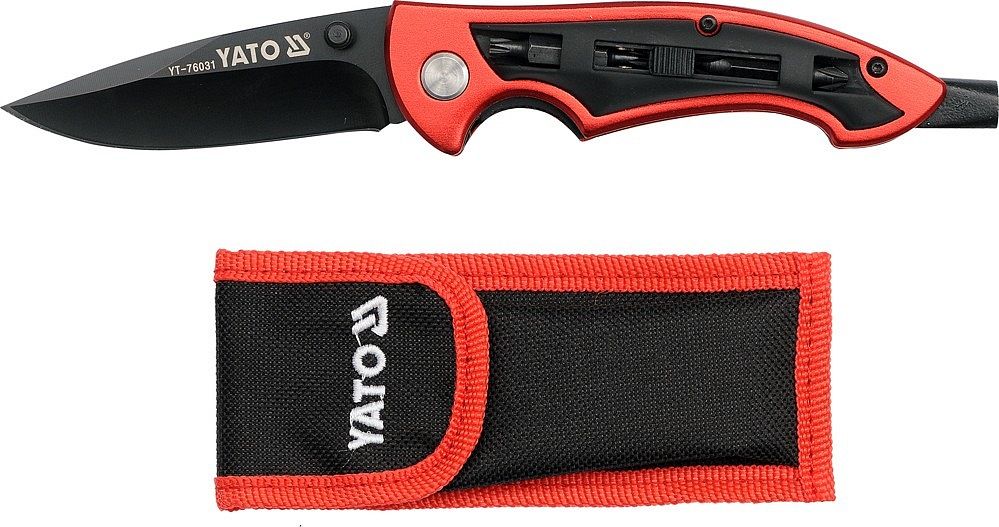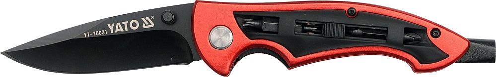 Kvalitní nůž YATO s bity ukrytými uvnitř těla rukojeti. Provedení čepele je z kvalitní nerezové oceli, rukojeť je z hliníku červené, metalické barvy.