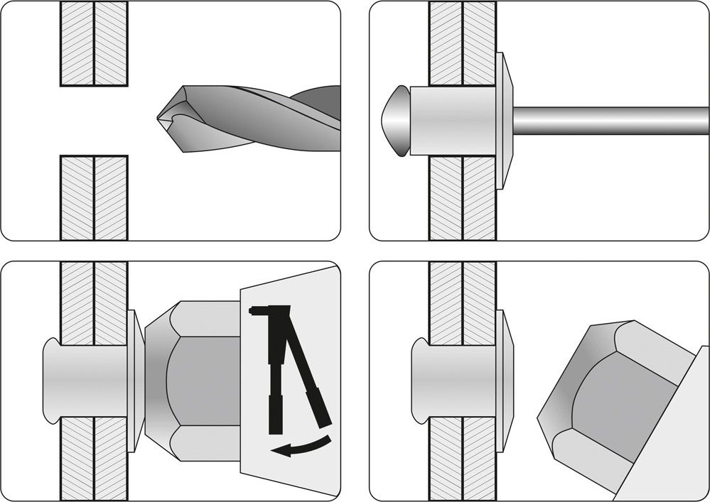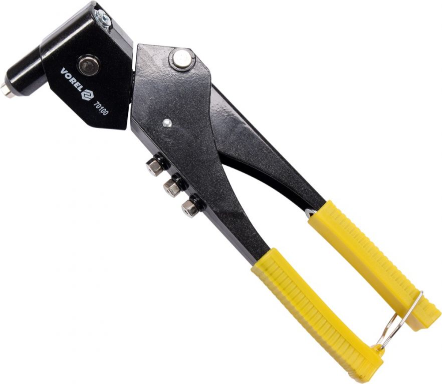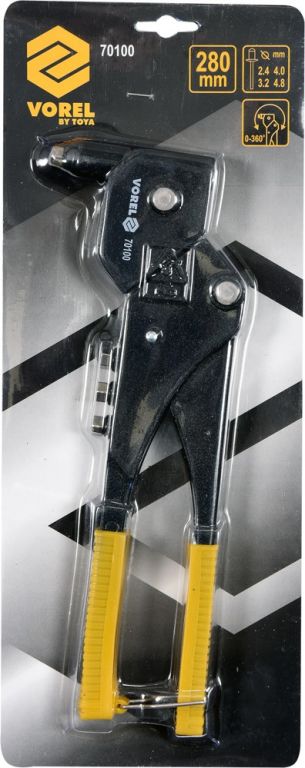Nýtovací kleště s otočnou hlavou, pro nýty 2,4 - 4,8 mm. Kleště jsou zhotoveny z aluminia, s rukojeťmi opatřenými gumovými návleky. Kleště jsou vhodné pro nýty z oceli, nerezové oceli a hliníku s rozměry 2,4; 3,2; 4,0; 4,8 mm.