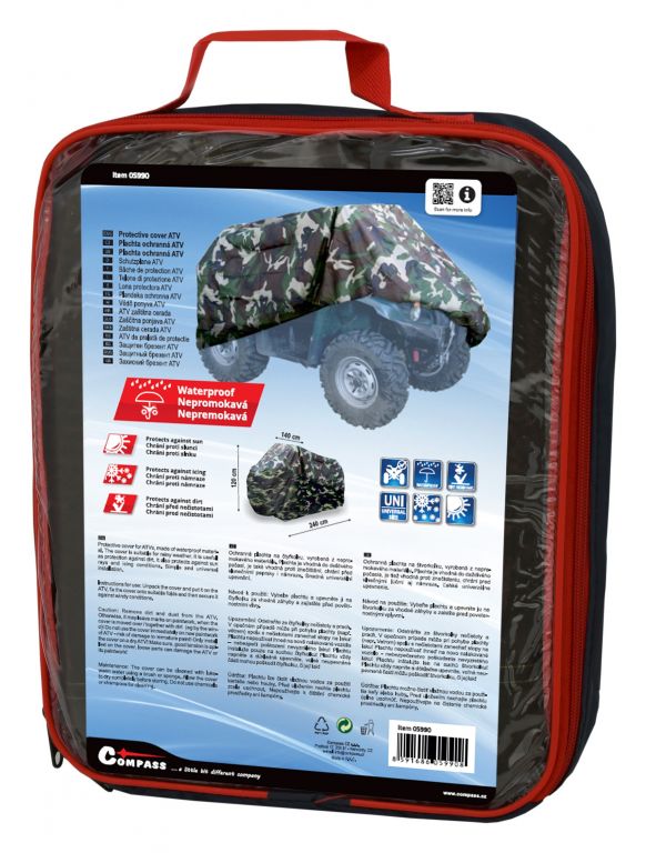 Ochranná plachta pro čtyřkolku, vyrobeno z velmi odolného nepromokavého materiálu. Plachta je ideální proti znečištění čtyřkolky, zabraňuje i a námraze. Jednoduché univerzální upevnění. Baleno v praktickém, na zip uzavíratelném balení, do kterého lze plachu po použití snadno složit a uskladnit. Jednoduché upevnění plachty - pouze se nasadí na čtyřkolku, na spodku se upevní část s všitou gumou za vhodné záhyby. Přední i zadní část plachty je osazena pevnými poutky, pomocí kterých lze plachtu ještě pevněji upevnit, například gumotahy apod (nejsou součástí dodávky).