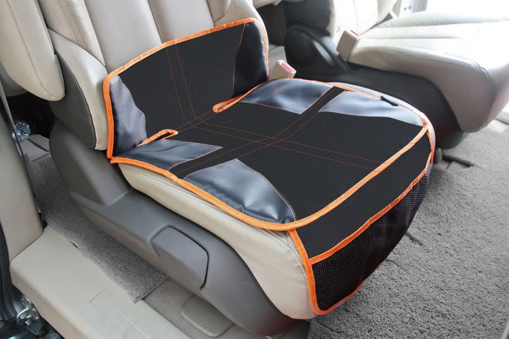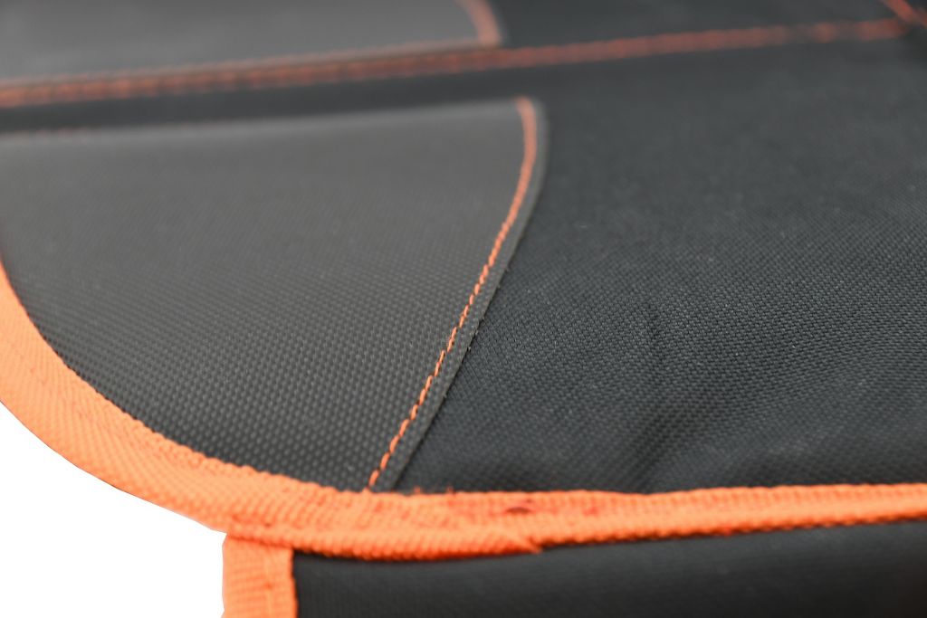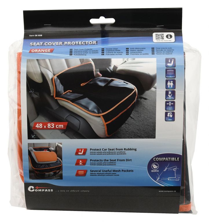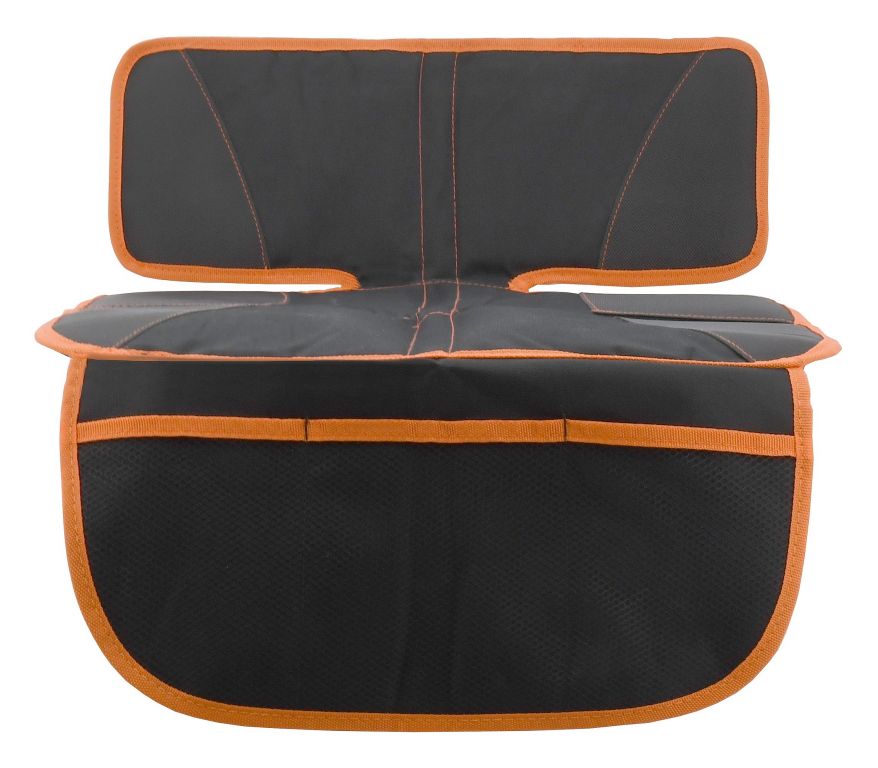 Praktický ochranný potah o rozměrech 48 x 83 cm zhotovený z odolného polyesteru, obšitého oranžovým lemem. Spodní vrstva je díky perforaci prodyšná a zároveň drží potah na místě. Potah je složen ze zádové části a sedací části, které se uplatní obzvláště při použití dětského podsedáku, či dětské autosedačky, kde chrání originální potah sedačky před poničením a znečištěním. Dále je opatřen praktickým, předním panelem, na kterém je našitý systém sítěnných kapes, pro různé potřeby a věci. Přední panel chrání přední část sedačky před znečištěním a poničením.