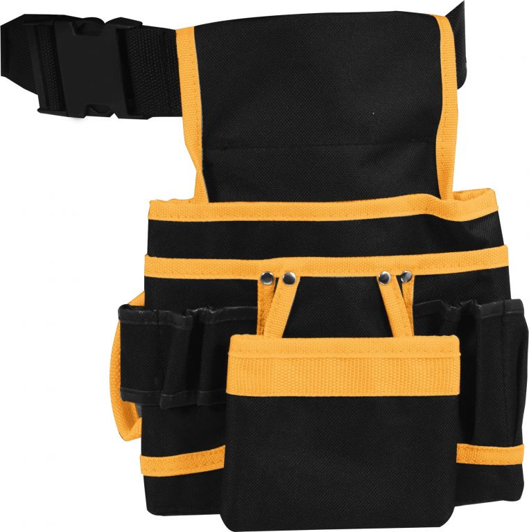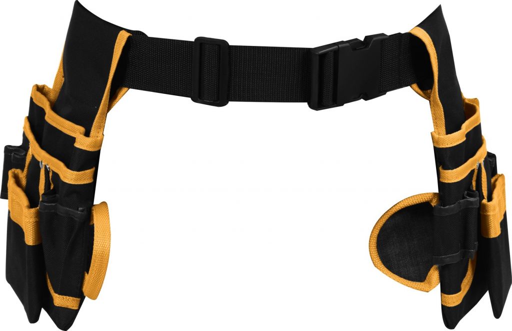 Opasek na nářadí s dvěmi posuvnými platformami s celkem 6 kapsami a smyčkou pro kladivo. Zhotovení z nylonu 600D se švy vyztuženými kovovými nýty. Pás je délkově stavitelný pomocí přesky se sponou.