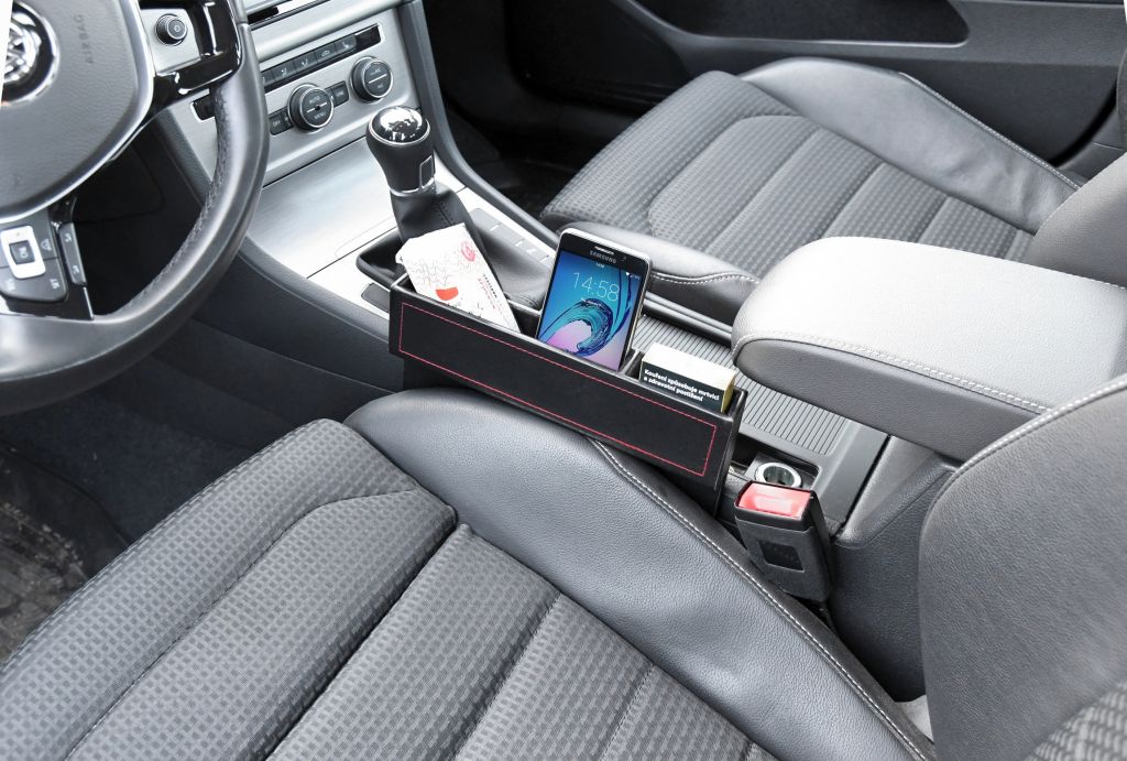 Praktická kapsa mezi sedadlo a středovou konzoli, kapsa je opatřena dvěma odkládacími prostory a je vhodná pro běžné drobnosti.