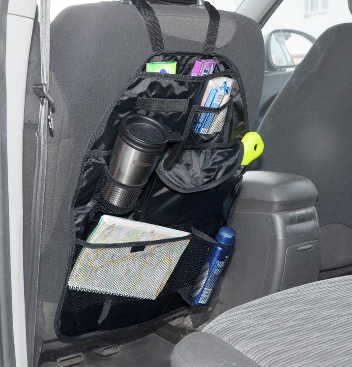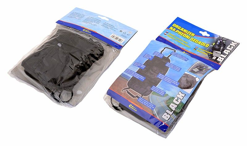 Organizér určený k připevnění na zadní stranu předního sedadla. Upevnění horní části pomocí popruhů za opěrku hlavy, spodní části popruhy za sedadlo. Jedinečné uspořádání - několik různých kapes vhodných pro mapy, nápoje a různé drobnosti.