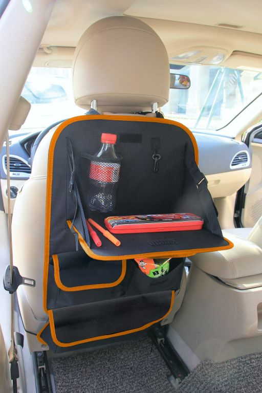Organizér na přední sedadlo s kapsami a praktickým stolkem. Disponuje 3x kapsou s uzavíráním na suchý zip a stolkem s nastavitelným sklonem, pomocí popruhů. Stolek je zajištěn před nechtěnným otevřením pomocí suchého zipu. Vnitřní prostor je opatřen karabinkou pro zavěšení různých předmětů a navíc je opatřen sítěnou kapsou na pití v plechovkách, či plastových lahvích. Organizér chrání sedadlo před znečištěním. Snadno a rychle se uchycuje na zadní stranu přední sedačky automobilu pomocí nastavitelného popruhu s klipem a pomocí provázků.