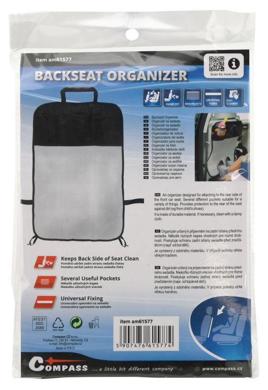 Jedinečné je především jeho uspořádání - několik různých kapes vhodných pro mapy, nápoje a různé drobnosti. Navíc organizér poskytuje ochranu zadní strany sedadla před znečištěním (např. od bot dětí).
