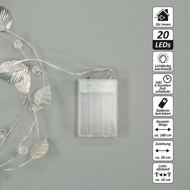 Párty a slavnostní osvětlení - tato pohádková světla s průhlednými plastovými korálky a lístky ve stříbrné barvě jsou vhodná pro každou slavnostní příležitost. Nastavte si vlastní světelné akcenty po celý rok a vyzdobte si dům, zimní zahradu nebo společenskou místnost. Možnosti designu se neomezují. Pomocí časovače můžete rozhodnout, kdy chcete osvětlení zapnout. Volně volitelná funkce časovače nebo nepřetržitého svícení.