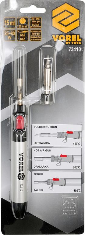 Lze použít jako pájku při 450 °C, opalovací pistoli při 1300 °C nebo horkovzdušnou pistoli při 600 °C. Výkon 30-70W zajišťuje plynulou práci. Objem nádrže 15 ml zajistí pracovní dobu až 60 minut. Pájka dále nabízí plynulé nastavení velikosti plamene, plynovou spoušť a rozkládací stojan.