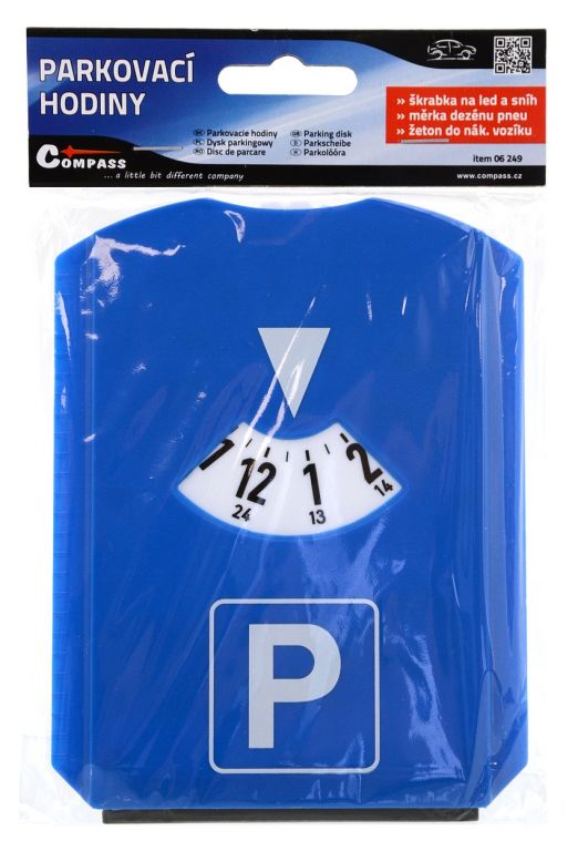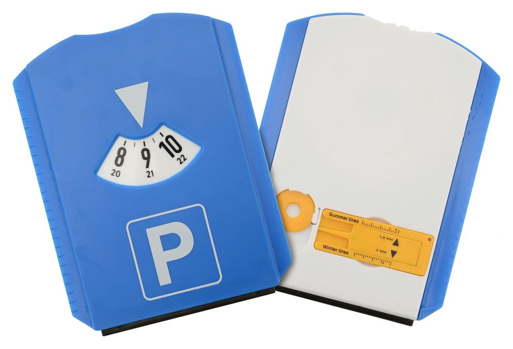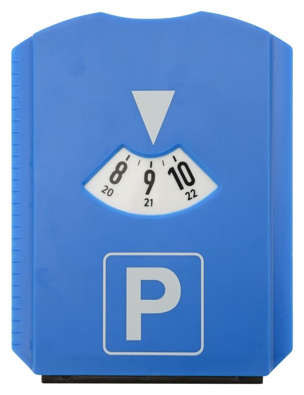 Parkovací hodiny z odolného plastu s otočným diskem. Tři hrany parkovacích hodin jsou provedeny jako břity škrabky, kterou lze použít na sníh, led a stranu s gumovým břitem i na vodu. Navíc jsou na zadní straně připevněny další užitečné pomůcky. Žeton do nákupního vozíku a měrka pro orientační měření hloubky dezénu pneumatik. Tuto multifunkční pomůcku tak můžete využít skoro každý den.