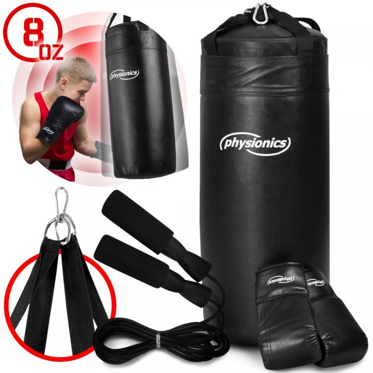Boxovací pytel o výšce cca 70 cm a hmotnosti cca 13 kg je určen především pro děti a mládež. Textilní popruhy odolné proti roztržení (šité křížovým stehem), které drží boxovací pytel ve 4 bodech. Boxerské rukavice (velikost 8 oz.) s širokým elastickým páskem pro bezpečný úchop, zesílenými švy a všitou částí na palci pro lepší ochranu palce.
