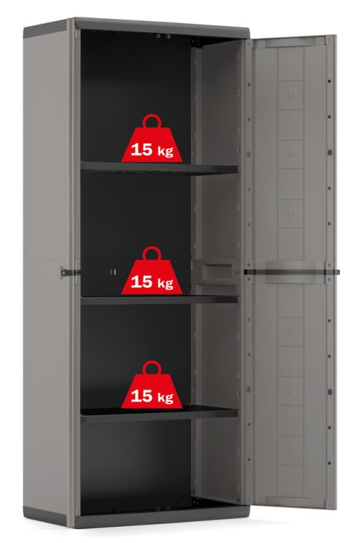 Jejich výhodou jsou snadno posunovatelné poličky i přizpůsobení na visací zámek. Mají snadnou montáž bez potřeby nářadí, jsou uzamykatelné na visací zámek (není součástí balení). Poličky snadno posunete nahoru či dolů podle svých potřeb.