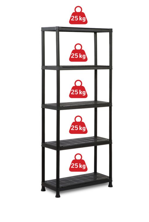 Jednou z nejlevnějších a nejjednodušších variant pro uskladnění věcí jsou plastové regály. Policový regál PLUS 75/5 vás potěší celkovou nosností až 125 kg, snadnou montáží bez potřeby nářadí i spojovacím systémem. - každá z 5 poliček unese až 25 kg- snadná montáž bez potřeby nářadí- regály se mezi sebou dají spojovat v pevný regálový systém- balení obsahuje i součástky pro přimontování ke zdi- zvýšené nohy umožňují zametení podlahy pod regálem- vhodný do domácnosti, garáží, skladů apod.