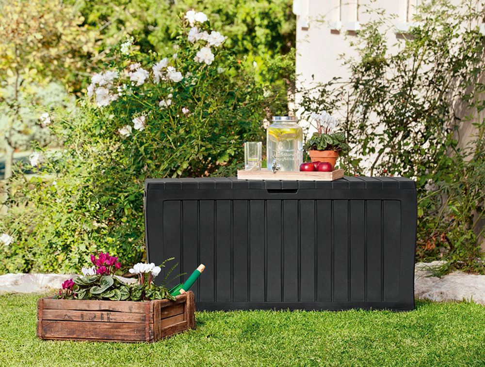 Plastový box pro uložení nejrůznějších předmětů (podušky, zahradní náčiní...) od firmy KETER. Výhodou tohoto boxu je jednoduchá montáž (bez využití nářadí - vše složíte jak stavebnici), vysoká kvalita boxu a moderní design. Materiál má UV ochranu a je odolný nepřízni počasí. Udrží až 220kg a tak ho můžete využít také jako lavičku.