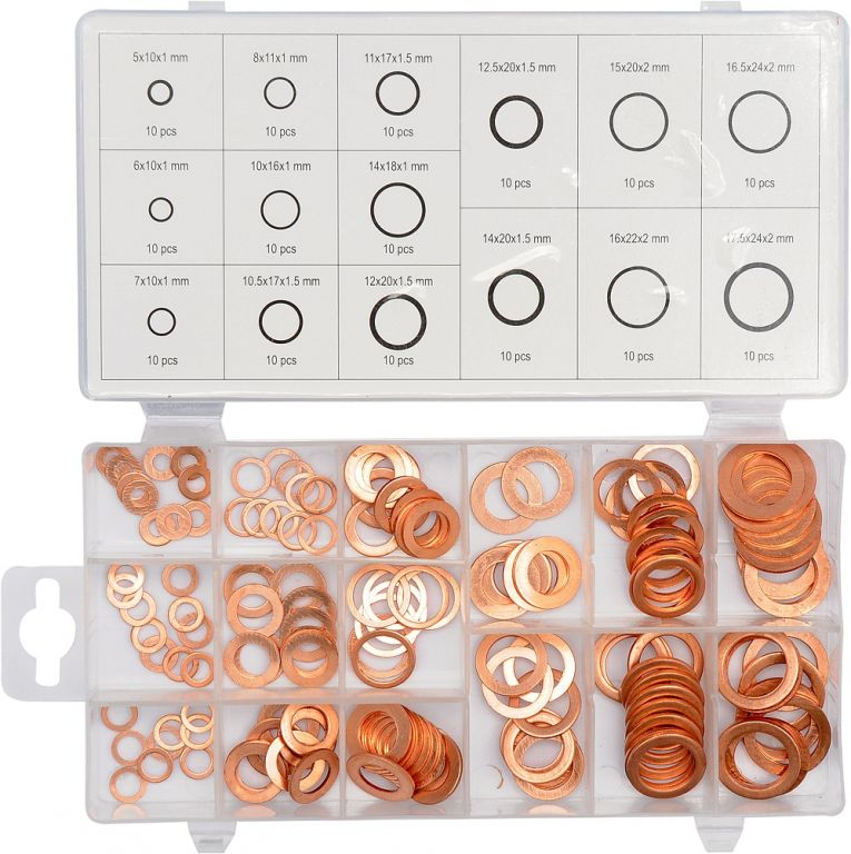 Sada 150 ks těsnicích podložek zhotovených z mědi, vše je přehledně uspořádáno v plastovém kufříku.