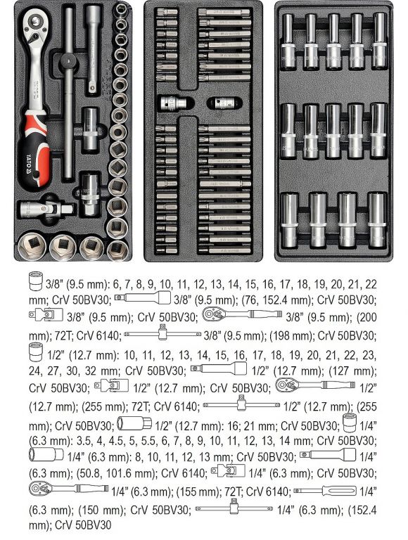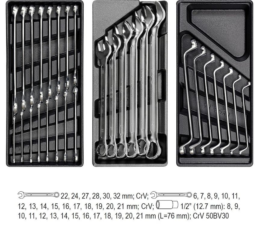 Dílenská skříňka značky YATO, vybavena 6 zásuvkami s kuličkovým ložiskem, 4 horní zásuvky obsahují pečlivě vybrané nástroje. Centrální zamykání na klíč, skříňka je vybavena protiskluzovými kolečky s brzdami a rohovými nárazníky, které chrání proti náhodnému poškození okolí (např. karoserie automobilu). Horní deska skříňky může sloužit jako stůl, je vyrobena z protiskluzového polypropylenu. Profily jsou vyrobeny z dvojité oceli - univerzální perforace umožňuje dovybavit skříňku dalšími prvky.