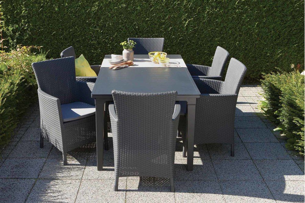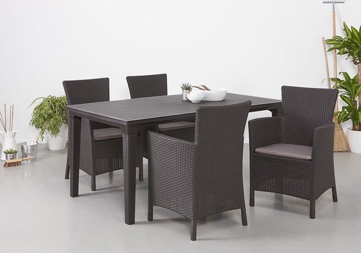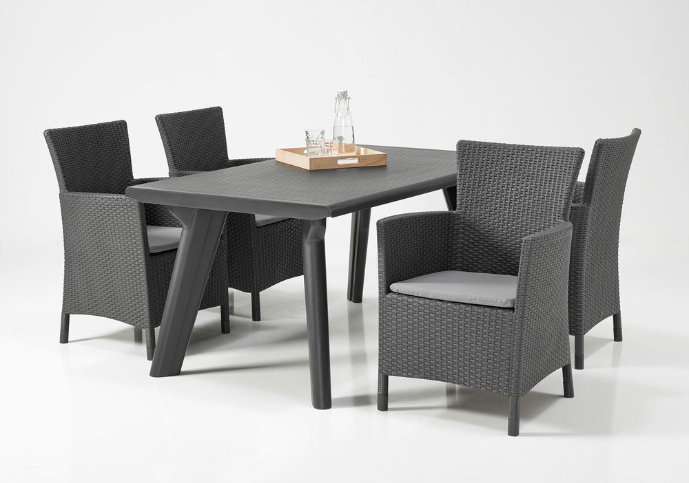 Plastové křeslo (imitace ratanu) v grafitové barvě + šedá poduška. Velmi komfortní křeslo vhodné jak do venkovních, tak vnitřních prostorů.