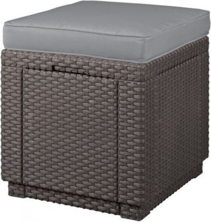 Taburet ve tvaru kostky s praktickým úložným prostorem. Je vhodnýpro venkovní i domácí účely. Výhoda je dlouhá životnost, odolnost a snadná údržba materiálu.